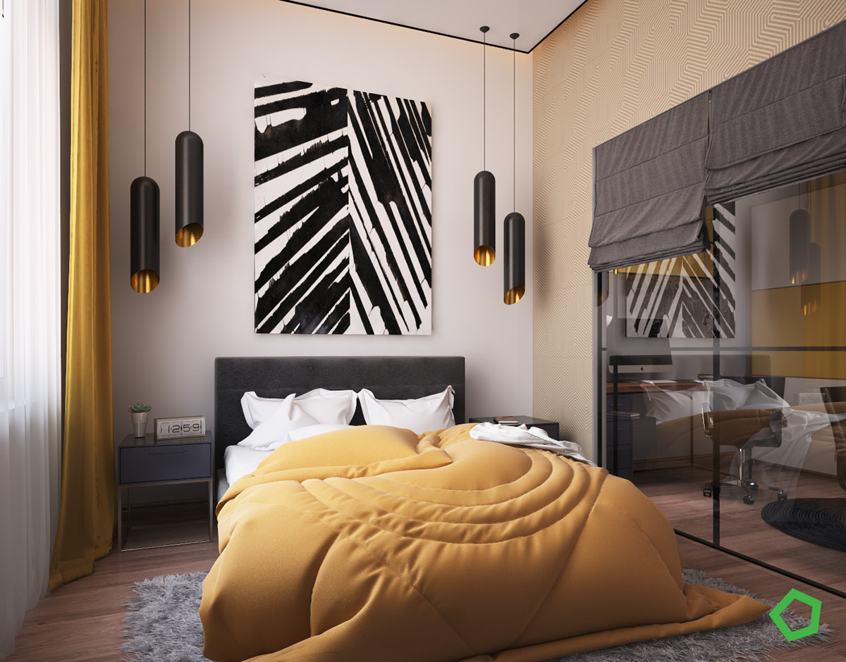При тези три смели интериорни оформления дизайнерите са предложили различните оттенъци на жълтото, преминавайки през мебелировката с весели жълти шкафове, слънчевата светлина по шарените тапети, пламналите като чисто злато завеси, дивана, постелката и дори плочките в банята. Висок жълт барстол, отново диван – този път в мек и ненатрапчив акцент, снимка на жена в жълто, висящи лампи и крушки в избрания цвят.