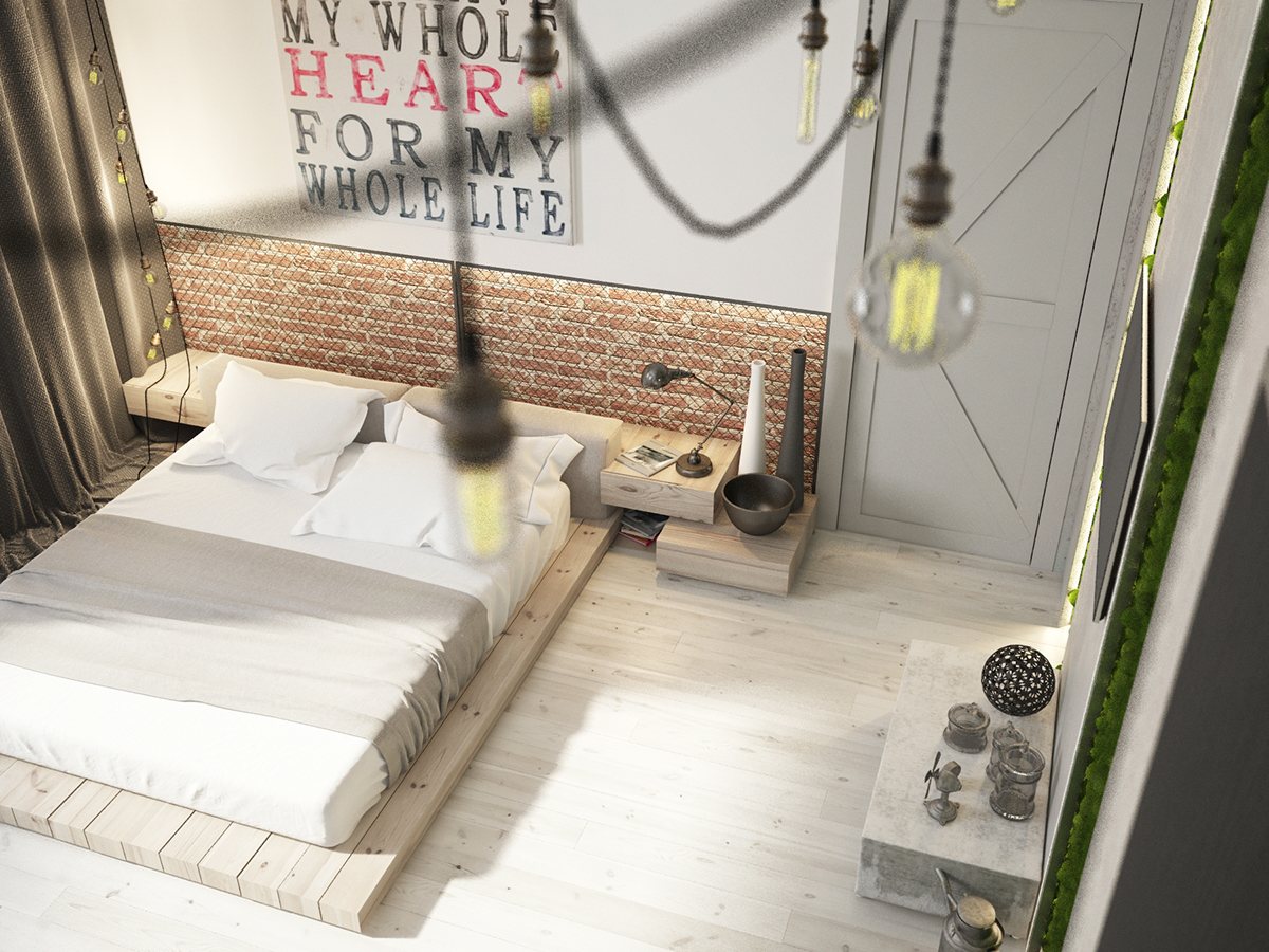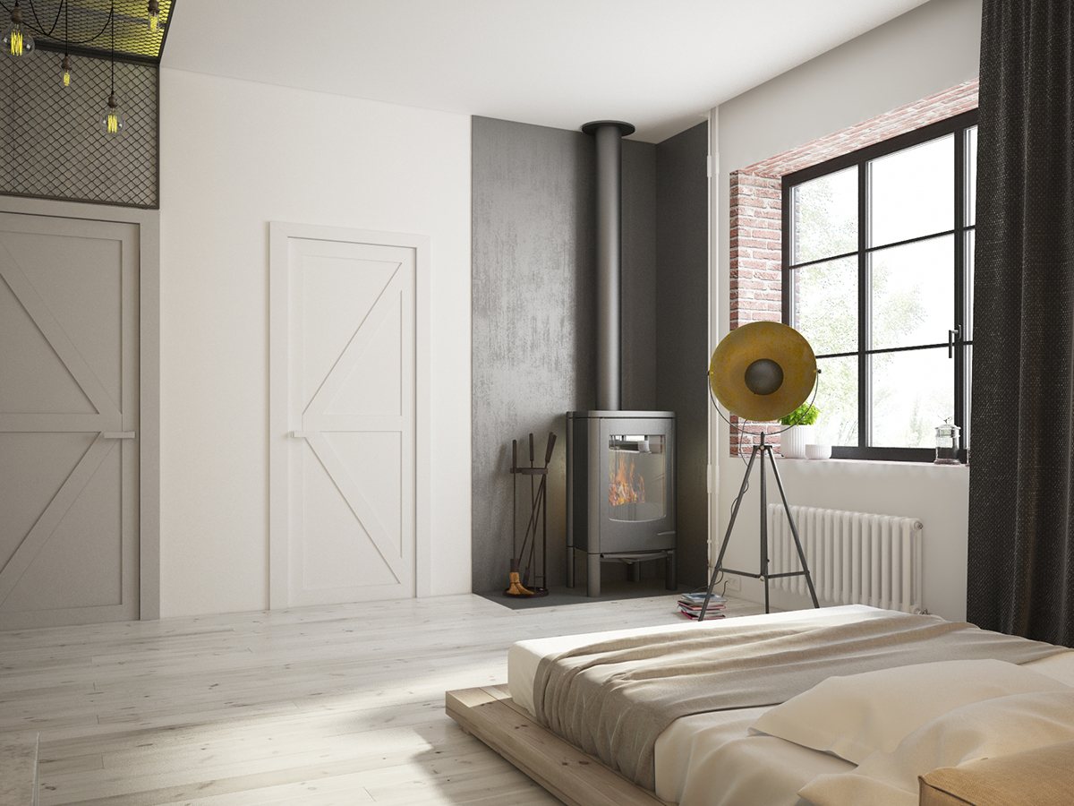 На горния етаж, спалнята прави силно първо впечатление. Вертикалната градина засилва градската естетика. Окото естествено се основава на успокояващото трептене на камината.