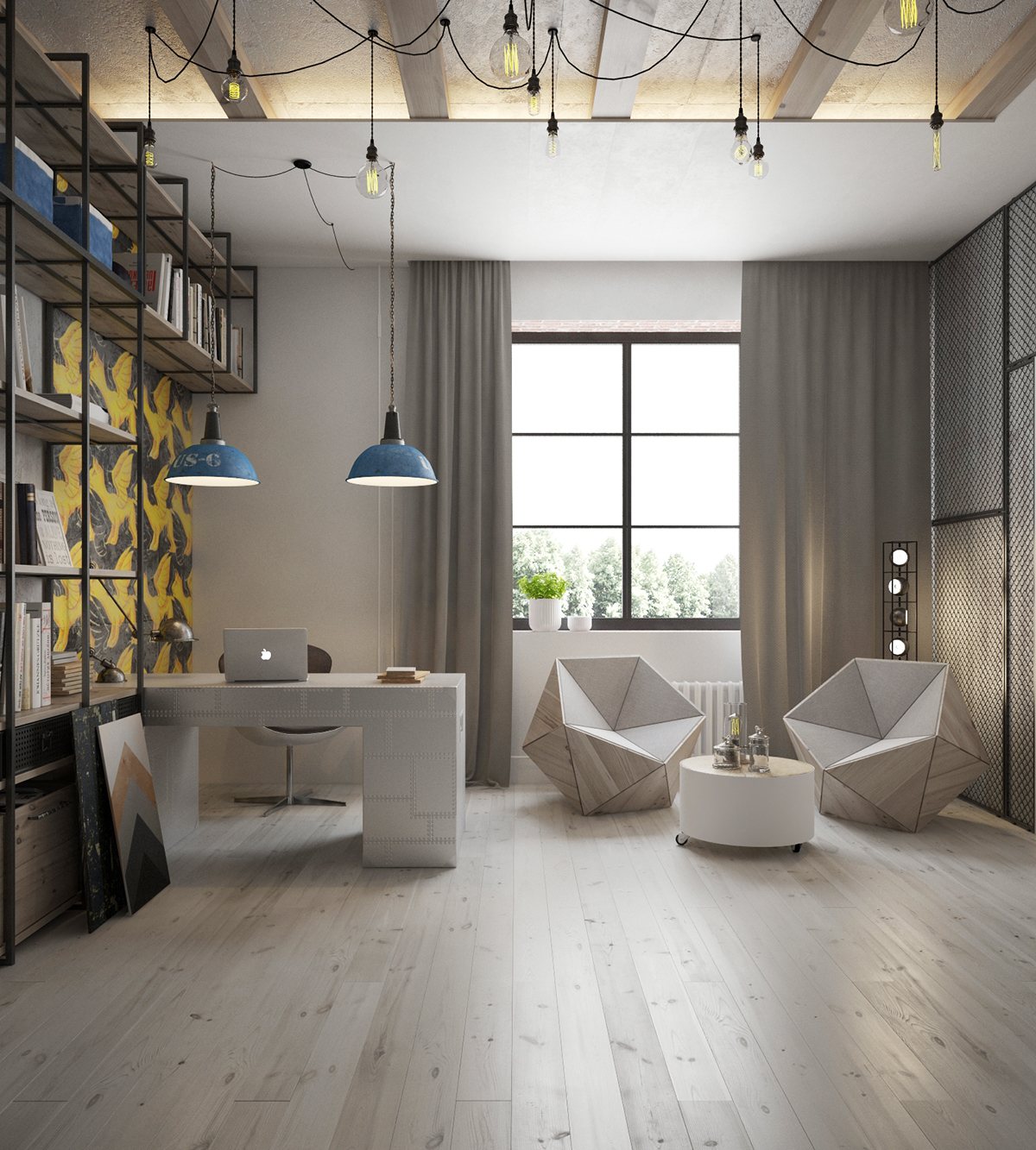 Като цяло, спалнята си остава изненадващо спокойна и гъвкава, въпреки смелото промишлената влияние. Офисът е творчески и привлекателен. Геометрични столове, облечени в дърво, осигуряват удобно място за срещи на семейни или бизнес гости, установени срещу драматичен фон над открития бетон.