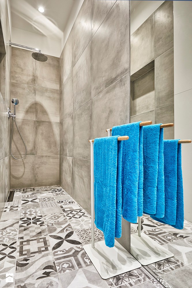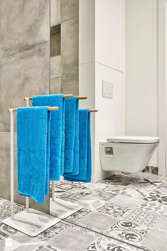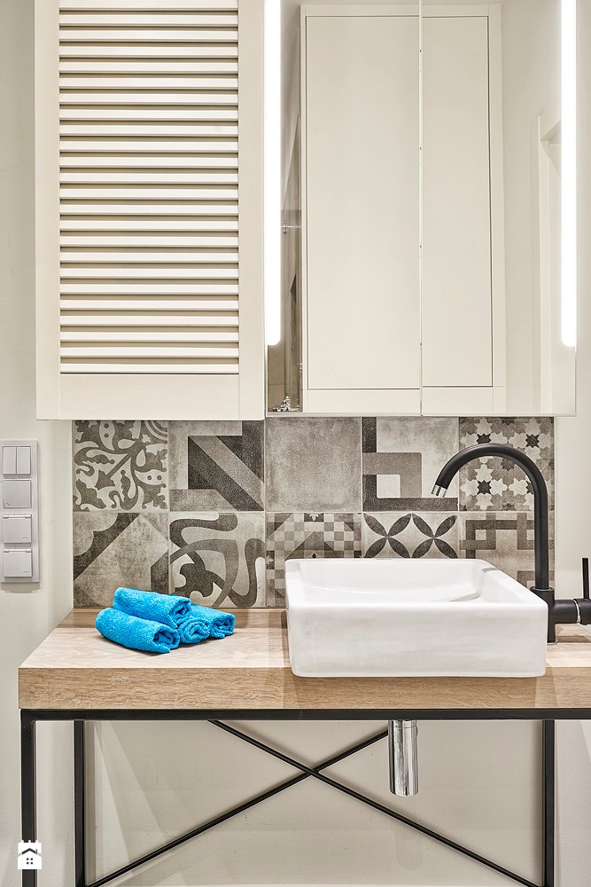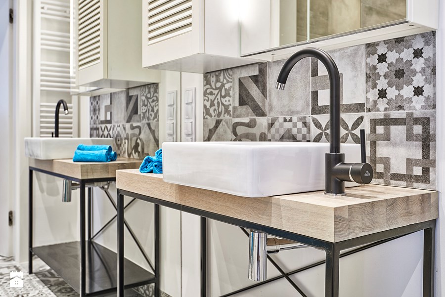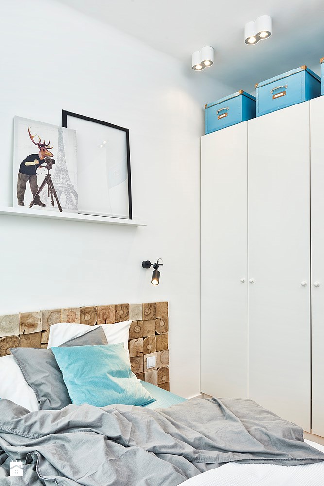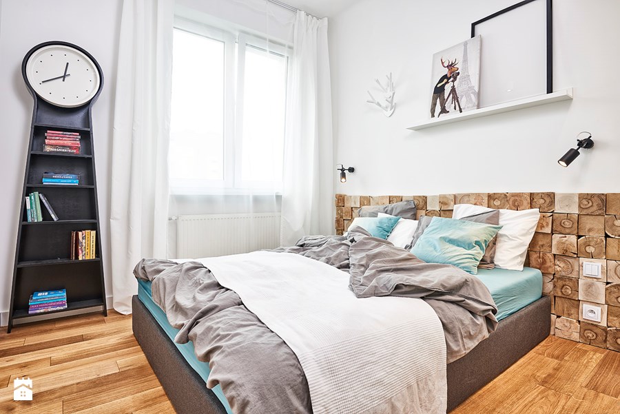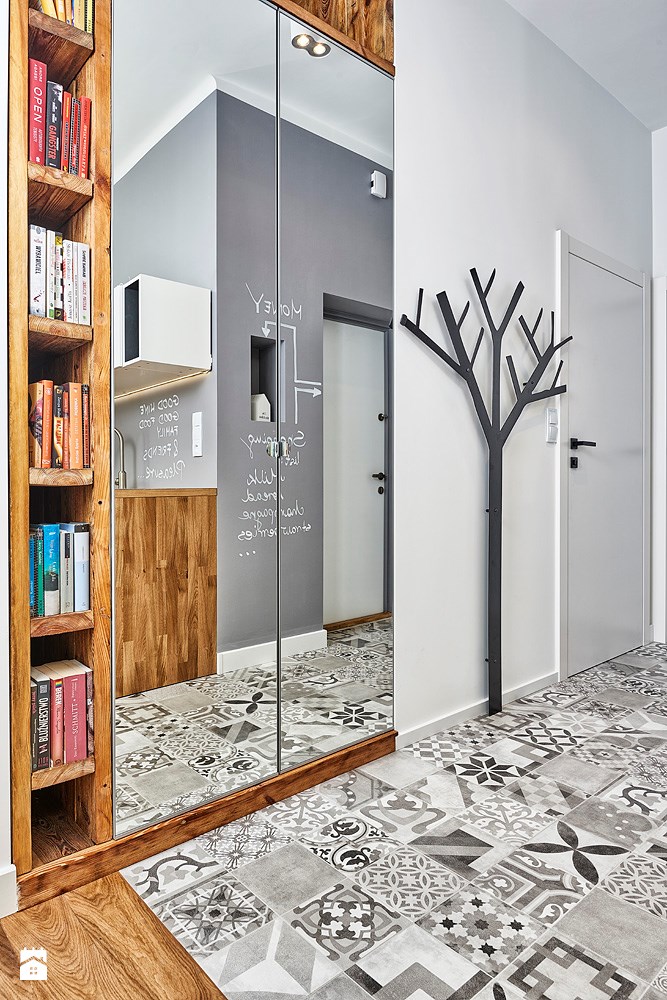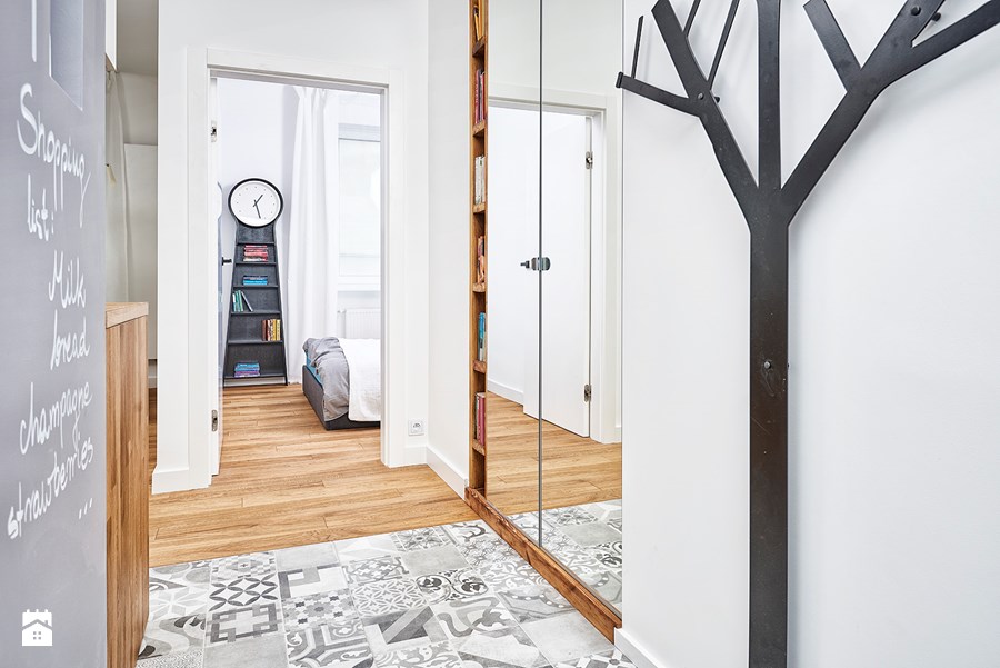 Поради ограничен бюджет, а и за малко по-индустриален вид, осветлението е решено с крушки, които просто висят без лампион. Понеже фоайето и кухнята са непосредствено до входната врата, не е трудно да предположим, че това ще са едни от най-замърсените повърхности в апартамента. Дизайнерите са се спрели на настилка в сиво, бяло и черно на геометрични фигури от материал, който лесно се почиства. Цветовете и геометричните десени правят помещението модерно и динамично. В спалнята има интересен елемент – часовник-библиотека. Самото легло няма табла, а борд от дърво, което придава усещане за повече текстура. Освен това е интересна добавка към цветната палитра на помещението.