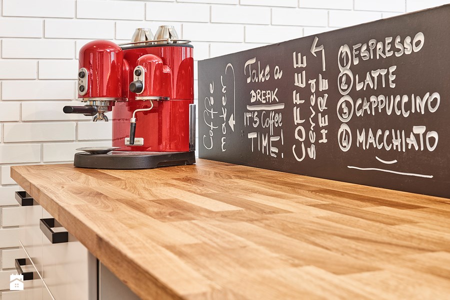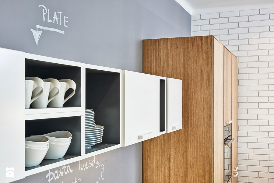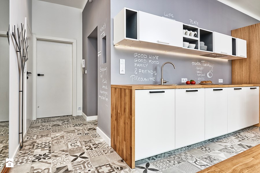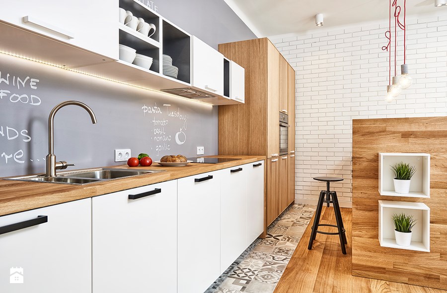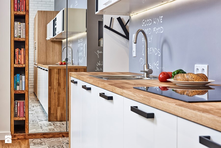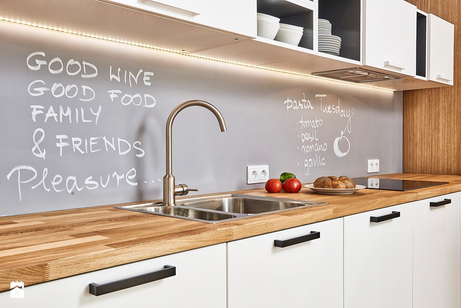 Вместо да сложи класическа черна дъска, тук дизайнерът е предпочел стенна облицовка, върху която може да се пише с тебешир, доста сходна с повърхността на училищна дъска. Това е великолепна идея, особено ако имате деца. Тук, облицовката е в кухнята, където можете да си оставяте тайни съобщения или да записвате рецепти, но можете да облицовате която и да е стена в апартамента си, винаги ще получите добър резултат.
