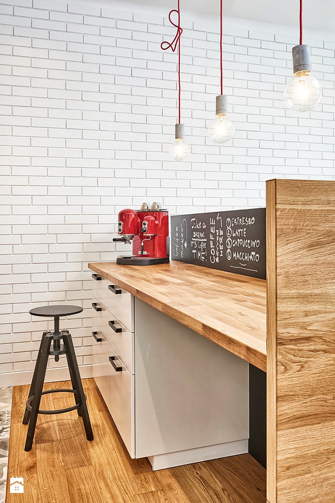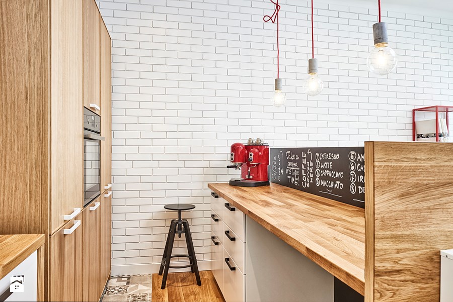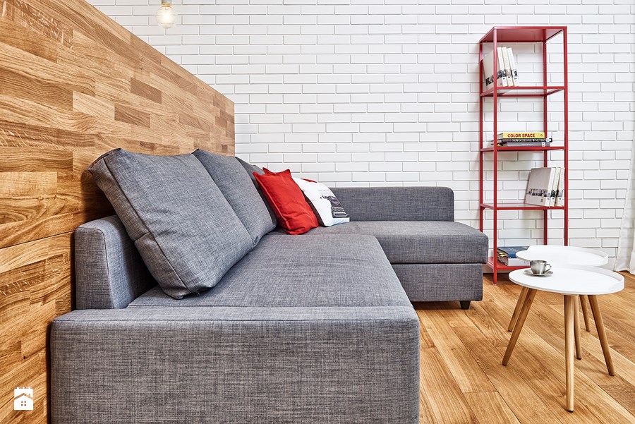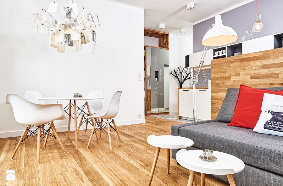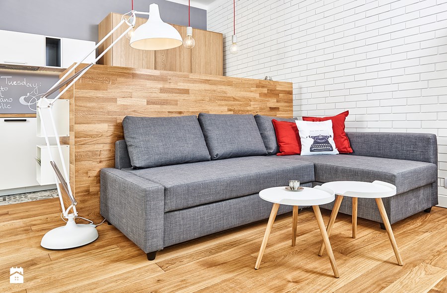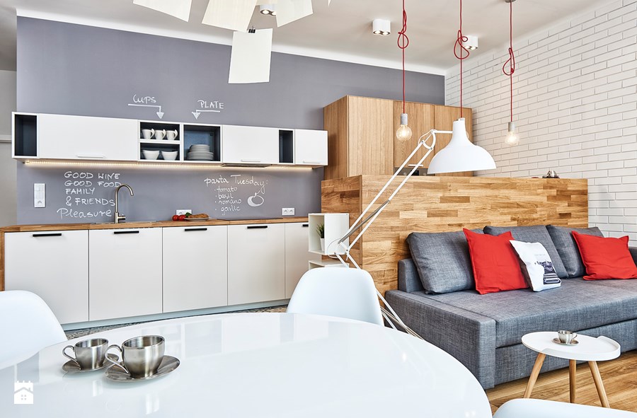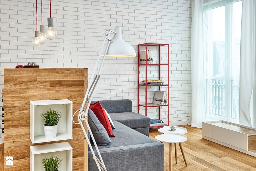 Стените към всекидневната и кухнята са съборени, за да пропуснат дневна светлина към цялата вътрешност. Така не само физически мястото става по-голямо, а и визуално. На помощ идва белият цвят, открита тухлена стена също в бяло, както и белите мебели, разбира се. Изненадващо, но бялото не прави обстановката стерилна. Защо? Разбира се заради комбинацията с топлият цвят на дъб, предпочетен за пода и плота в кухнята. Комбинацията бяло-дървесно е характерна за скандинавския интериорен стил. Към това, дизайнерите са добавили червени акценти и малки по размер мебели в светло сиво.